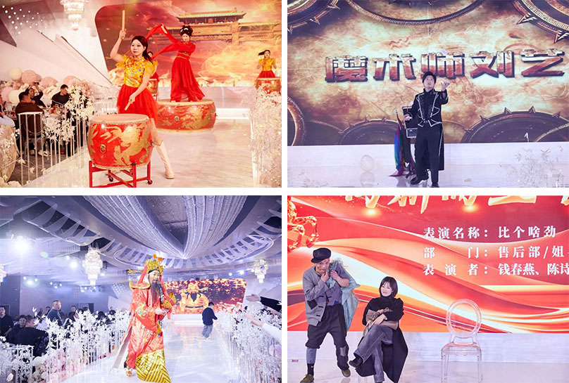 晚会节目精彩纷呈,均由公司员工自编自演,展现了团队的创造力与凝聚力。生产部《三句半》、技术与销售部联袂演出的搞笑舞蹈《青蛙舞》、生产仓库《马年Style》等节目轮番登场。由售后部带来的创意走秀《样品奇遇记》,将公司产品从车间搬上舞台,结合产品功能与艺术表达,呈现了一场别开生面的视觉盛宴,赢得现场阵阵掌声。